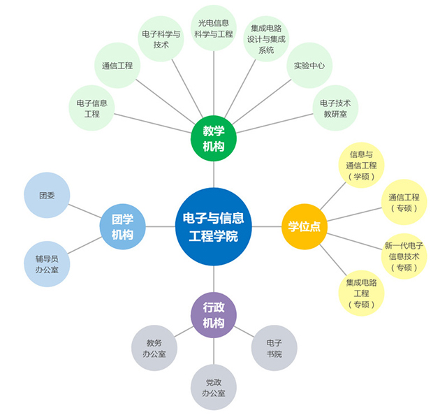 学院设人工智能联合学院、电子书院、通信系、信息系、电子系、光电系、电子技术教研室、实验中心、科创中心、党政办公室及辅导员等机构。拥有电子信息工程、通信工程、电子科学与技术、光电信息科学与工程、集成电路设计与集成系统5 个本科专业,及信息与通信工程、新一代电子信息技术、通信工程、集成电路工程4 个硕士点。组建了电力物联网、人工智能、5G 通信等10 余个教学科研团队。