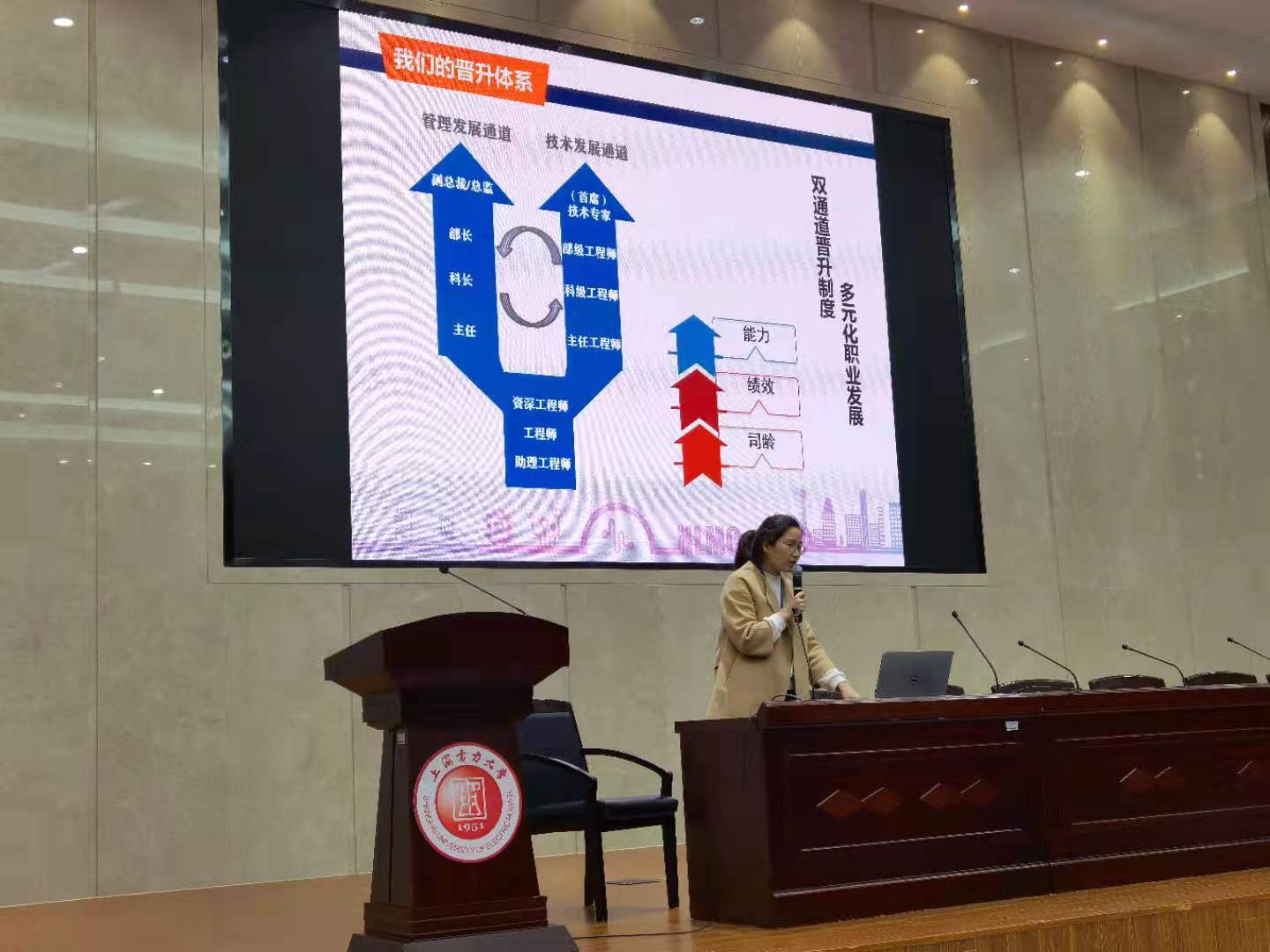 卫洁还为同学们详细介绍了此次春季招聘的岗位、公司对新员工的四维培养方案、员工的薪酬福利体系以及双通道晋升制度,并为2022届的同学们介绍了人才训练营的培养体系。宣讲结束后现场进行笔试考核和简历投递,随后在bat365中文官方网站4楼对2021届毕业生进行了分组面试。