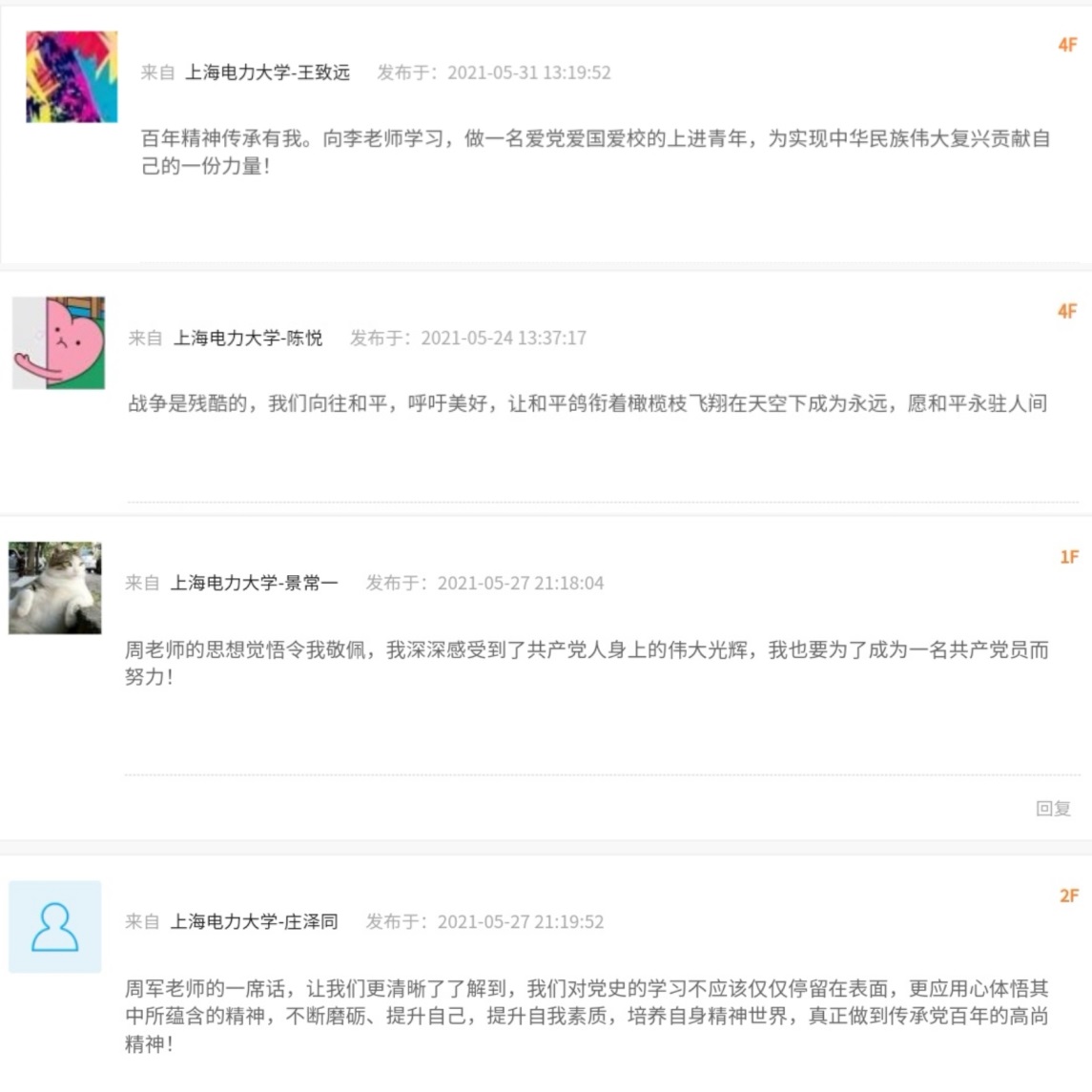 本次“党史学习,传承对话”活动,形式新颖,内容丰富,公众号与易班平台在发出后也收到了同学们的积极留言。同学们纷纷表示作为新时代的大学生,更应牢记革命先辈们用生命与热血书写下的百年党史,传承共产党员的优秀品质。下一步,bat365中文官方网站将继续围绕党史学习教育开展系列活动,培养学生党性底蕴,以优异成绩迎接建党一百周年!