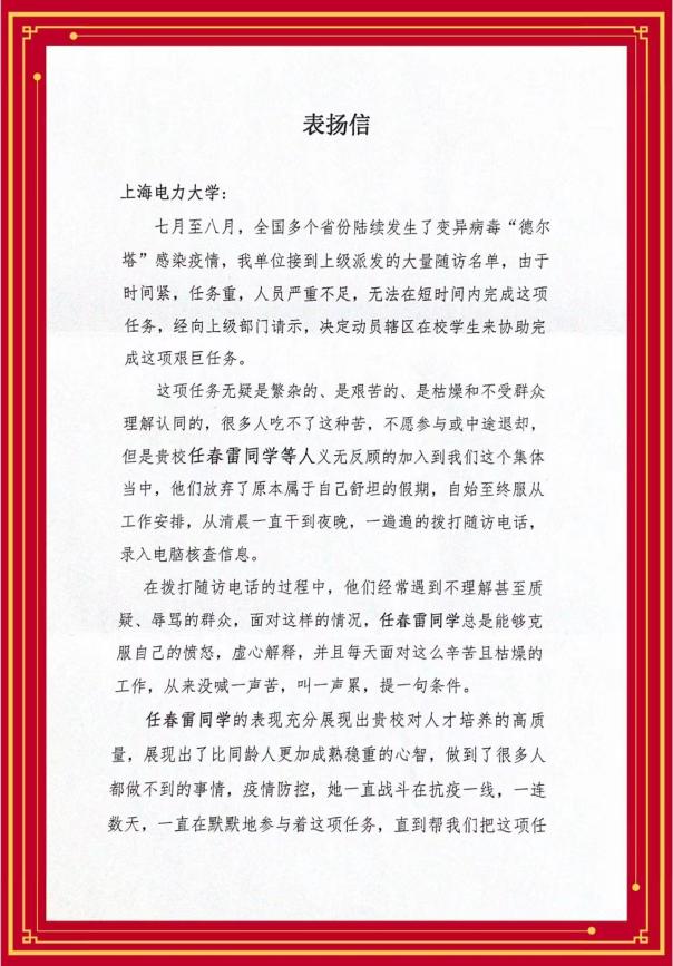 信中指出,今年暑期变异病毒“德尔塔”来势汹汹,平度市新河镇因靠近当时为“中风险地区”的烟台市,相关排查工作给当地疫情防控部门带来了不小的挑战。任春雷同学积极报名参与疫情防控志愿服务活动,放弃了舒适的假期,面对繁杂、艰苦、枯燥的工作和群众的不理解,都能耐心处理。任春雷同学负责电话随访、信息核查录入等工作,从清晨一直干到夜晚,一连数日,直到配合当地部门完成任务。任春雷同学以实际行动充分展现了当代大学生的优良素质、崇高品格、家国情怀和bat365中文官方网站人才培养的高质量,同时感谢学校对学生品德的精心培育。