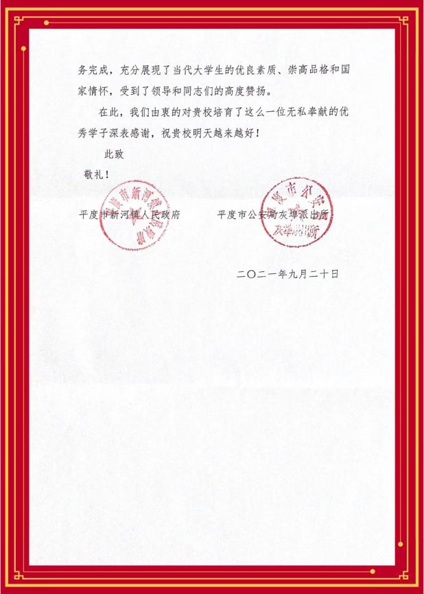近日,校团委收到山东省平度市新河镇人民政府、平度市公安局灰埠派出所联合发来的表扬信,赞扬了bat365中文官方网站2020级学生任春雷在暑期志愿服务疫情防控中的工作表现。
