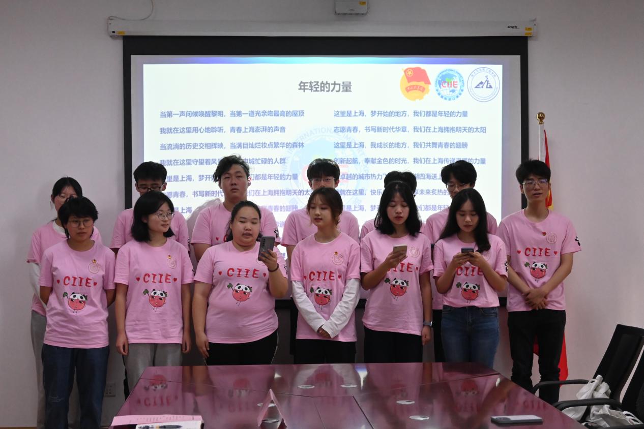 志愿者们用饱满的热情合唱进博会志愿者主题曲《年轻的力量》,在歌声中再次激励自己在服务中积极践行“奉献、友爱、互助、进步”的志愿者精神,点亮青春之光。