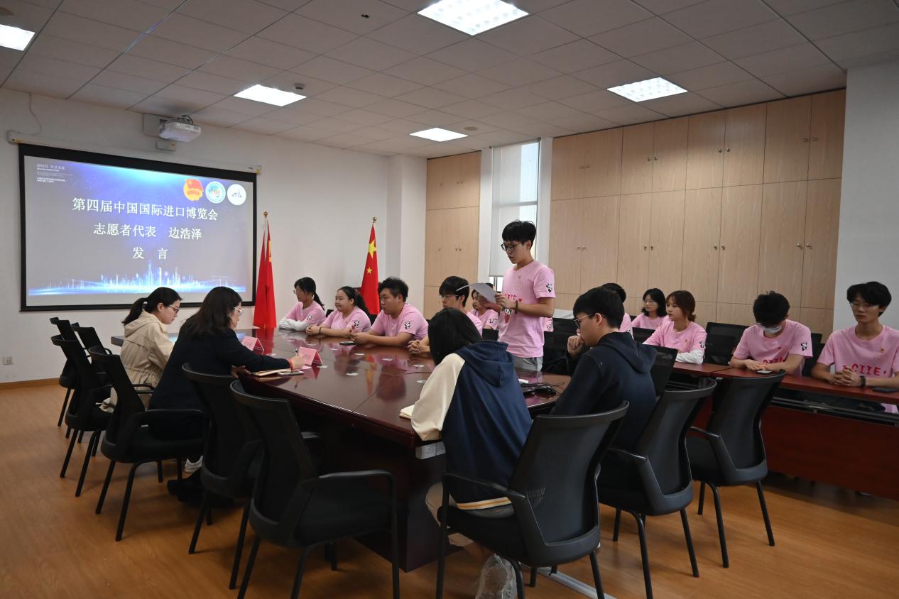 活动伊始,bat365中文官方网站团委副书记助理王惠介绍了第四届进博会志愿者的招募情况,bat365中文官方网站团委积极响应校团委的部署,九月底开展进博会志愿者招募工作,共计45名同学积极报名参加,经过层层筛选,bat365中文官方网站最终选拔出14名进博会志愿者,包含10名正式志愿者、2名储备志愿者以及2名经校团委考核的一级体验官,其中研究生3名,本科生11名。