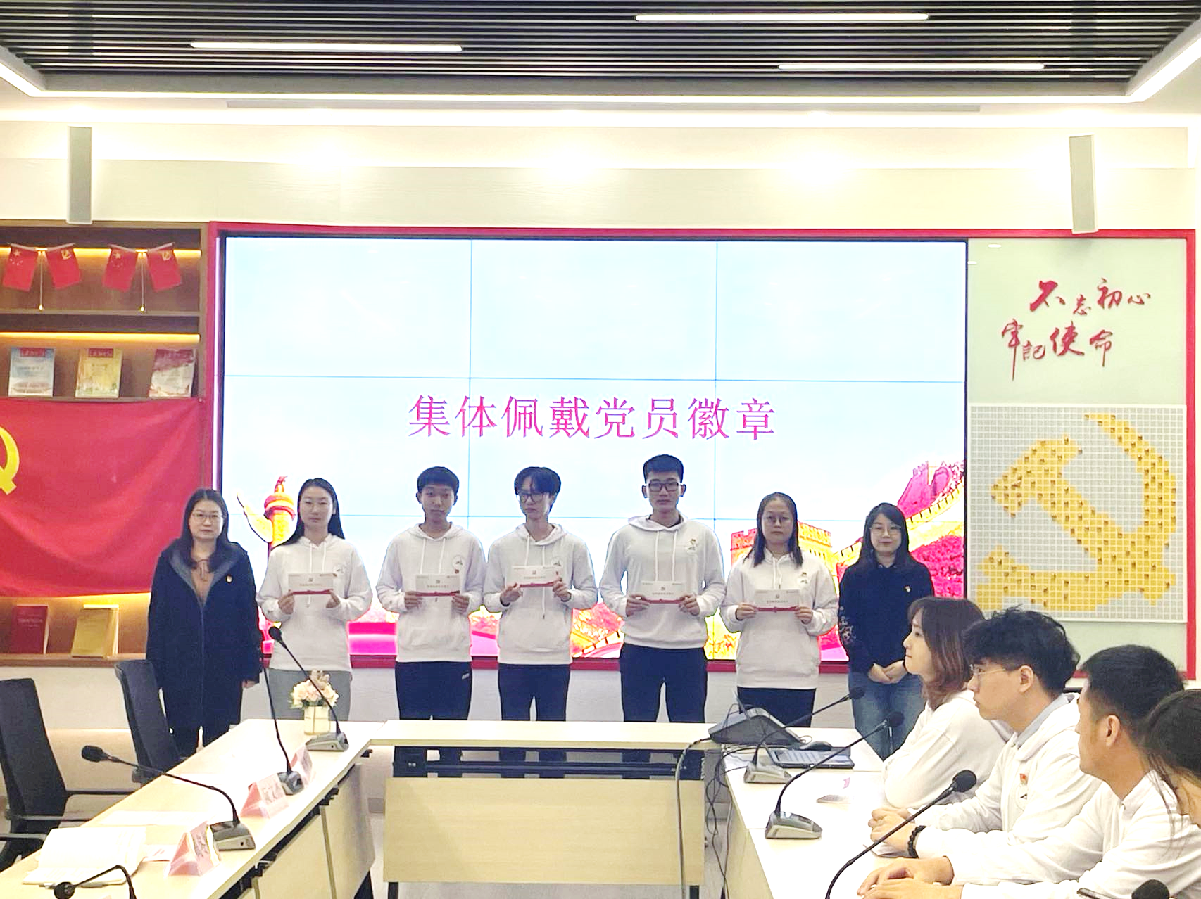周冬梅宣读了《中共bat365中文官方网站委员会关于批准接收贾明潇等13位同志为中共预备党员的通知》,随后与各党支部书记共同为新发展党员佩戴党员徽章,发放党员生日贺卡,与新党员们共享成长的喜悦。
