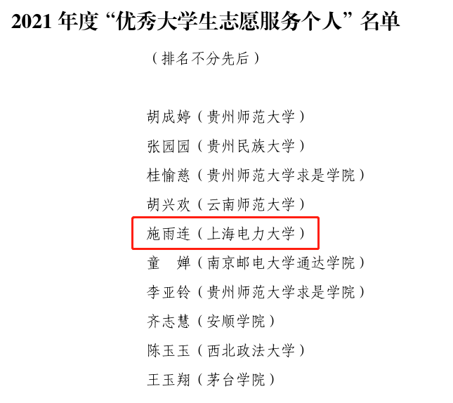 近日,经过贵州省安顺市西秀区驻外工委认真组织、严格评选,授予bat365官网bat365中文官方网站施雨连同学2021 年度“优秀大学生志愿服务个人”称号。本次活动共有10位同学入选。