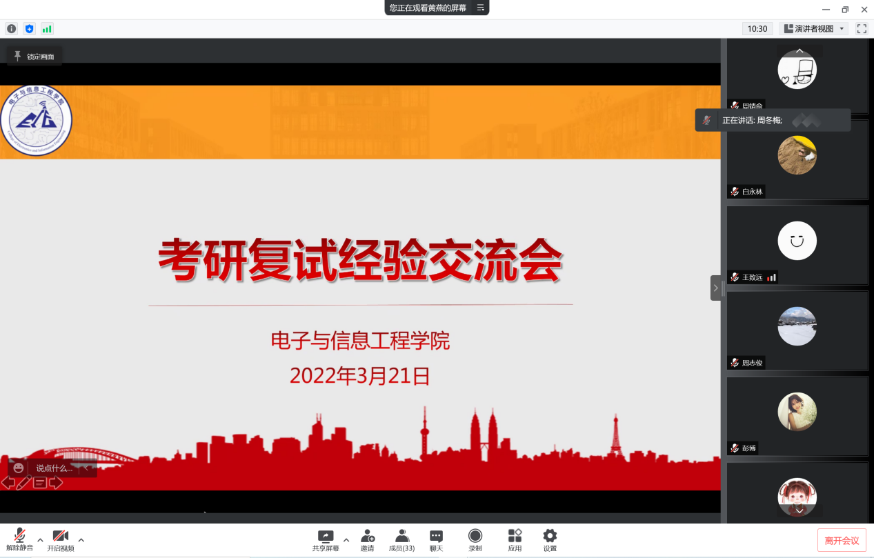 抗疫不停学,在这段特殊时期,为了使进入考研复试的同学掌握更多相关技巧,以良好的状态备战复试,bat365中文官方网站于3月21日晚上7:00举办了线上“考研复试经验交流会”。bat365中文官方网站党委副书记周冬梅、光电科学与信息工程专业教师薛亮、就业专项负责人黄燕、毕业班辅导员许晓天、崔释匀参会。会议还邀请了往届优秀学子进行分享。