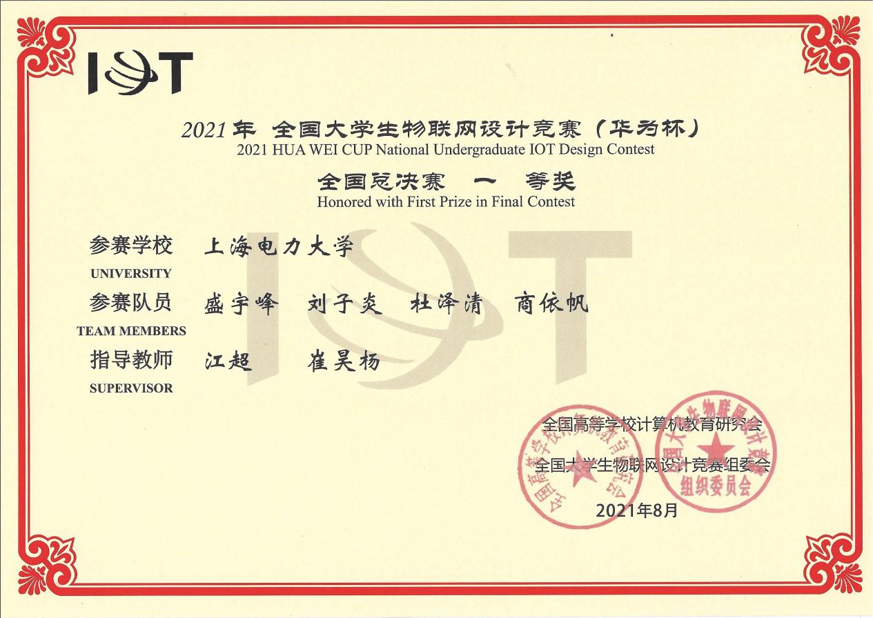 由华为技术有限公司冠名赞助的2021年全国大学生物联网设计竞赛(华为杯)共吸引了来自571所高校的1475支队伍,参赛学生规模达6945名,指导教师1461名。由bat365中文官方网站盛宇峰、刘子炎、杜泽清、商依帆同学组成,江超老师、崔昊杨教授指导的“空天地立体化智慧电网线路守卫者”小组通过选择自主命题赛道,一路过关斩将,杀入全国总决赛,并与145支参赛队伍通过在线视频答辩、6强争霸等环节展开了最后的角逐。在经过国内几十所高校和企业的32位评审专家严格细致的把关后,成功获得全国一等奖。