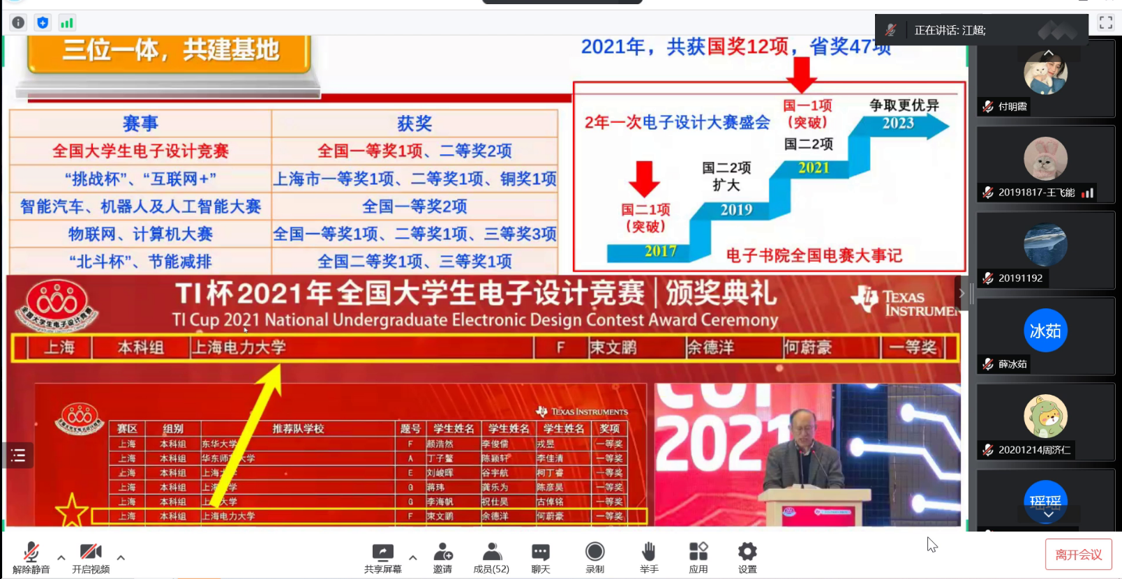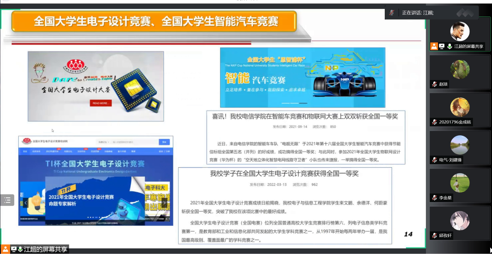 江超老师从专业、学科、工程教育认证的12条毕业要求以及“互联网+”大学生创新创业大赛切入主题,创新创业教育是一个系统性的工程,与教育教学相辅相成,同为一脉。解读了学院创新创业训练与实践学分管理办法以及本科生科研能力提升计划管理办法。详细介绍了bat365中文官方网站创新创业教育基地--电子书院-科创中心-电子学社一体化窗口建设,回顾了近年来学院在互联网+、挑战杯、电子设计竞赛、智能汽车竞赛等各类含金量颇高的赛事中的辛勤付出与收获。以及双创基地在社会服务方面做出的突出贡献:积极参加70周年校庆、招生宣传、校宣传片拍摄等活动;2次承办临港大学堂科创小英才bat365中文官方网站创客未来夏令营活动;2021年以来走出校园,科普宣讲十余场次,服务上千名中小学生。