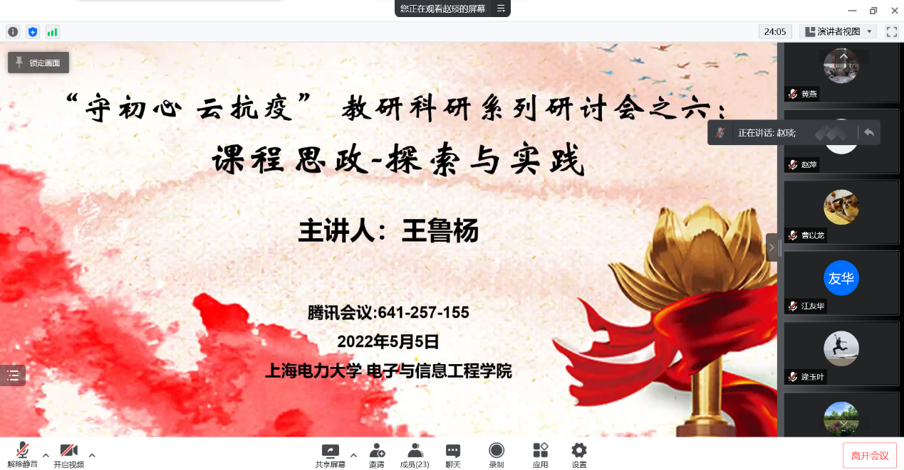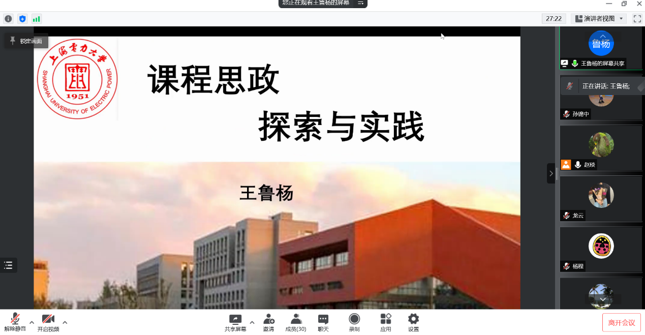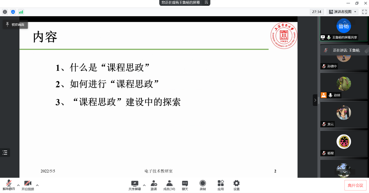 5月5日,bat365中文官方网站邀请了电气工程学院电子教研室主任王鲁杨老师在腾讯会议线上为学院教师主讲题为《课程思政-探索与实践》的学术讲座。学院党政班子领导和各专业教师参加了会议。