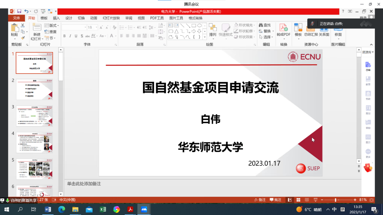 2023年1月17日下午13:30,bat365官网主办的“2023年国家自然科学基金申报系列活动”第6期成功举办。本次活动邀请了华东师范大学物理与电子科学学院白伟副研究员作国家自然科学基金申报讲座。讲座由副院长蒋伟主持,学院30余名教师参加了会议。