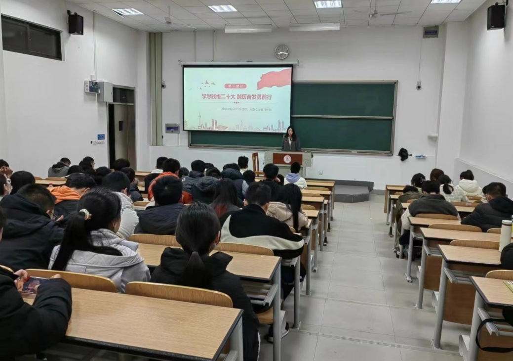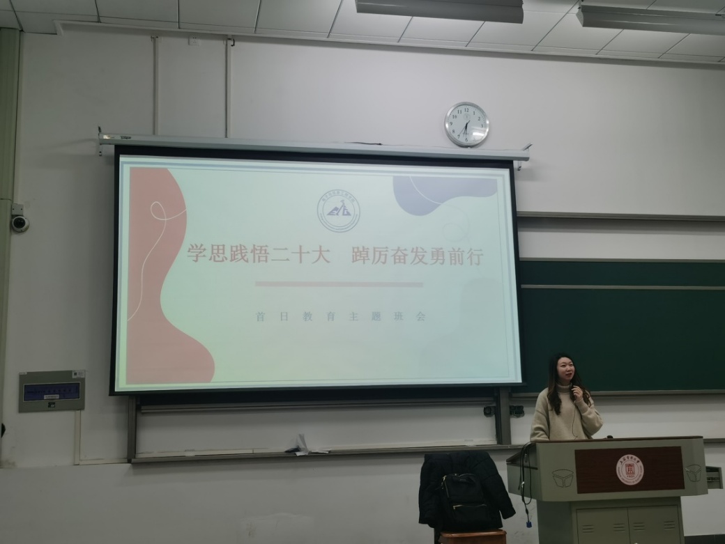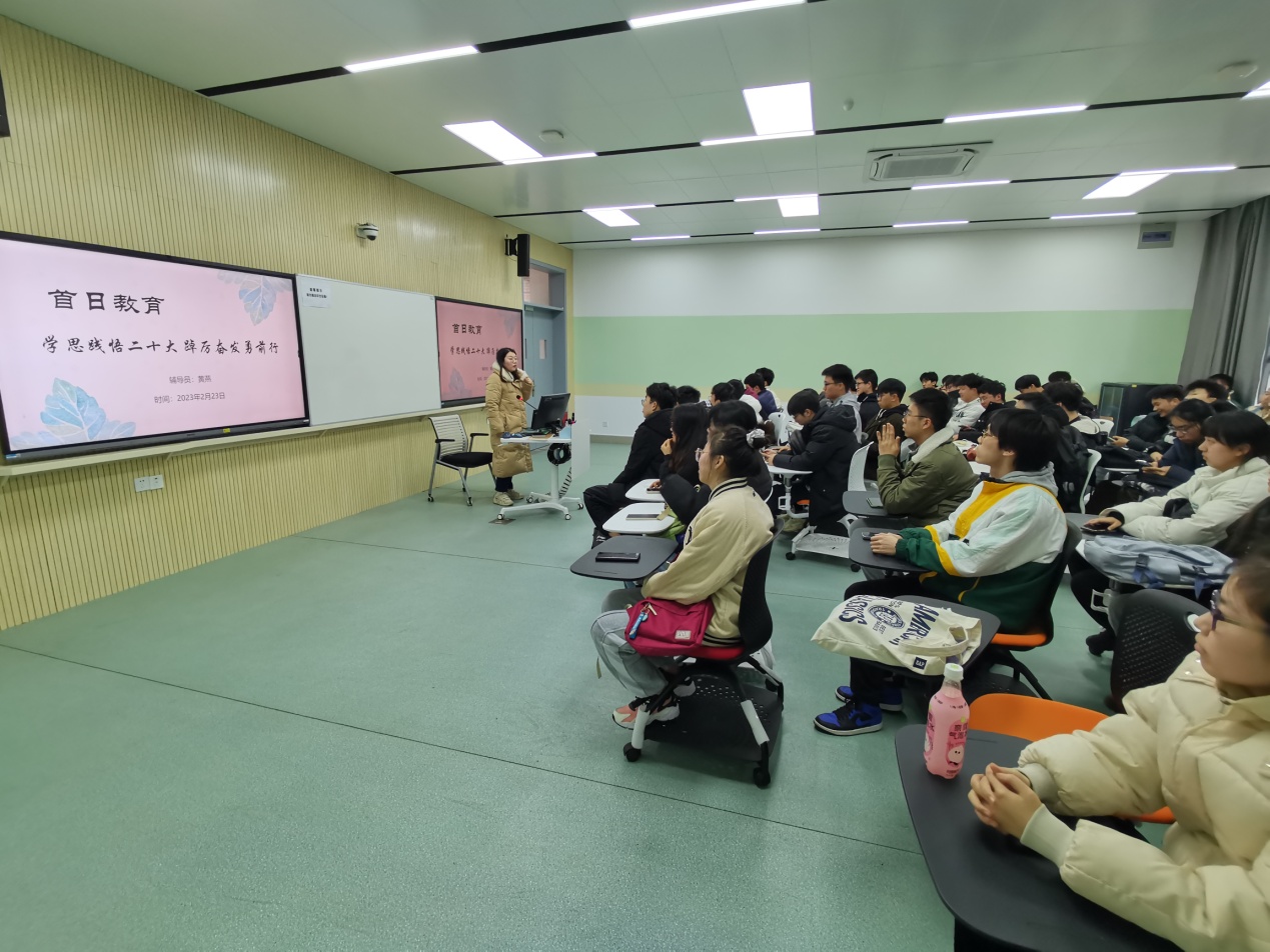 学院各辅导员结合首日教育要求,带领学生学习领会中国共产党第二十次全国代表大会的重要精神以及重大历史意义,回顾了党的二十大的内容和主题,再次强调“中国式现代化”这一概念内涵和本质要求,使学生更进一步明白了党的二十大深刻阐释的新时代坚持和发展中国特色社会主义的一系列重大理论和实践问题,理解了党的二十大描绘的全面建设社会主义现代化国家、全面推进中华民族伟大复兴的宏伟蓝图,坚定了听党话、跟党走的信念,保持砥砺奋斗、永不懈怠的精神状态。同时,本次首日教育班会将学习党的二十大精神与学生的实际生活相结合,增强了同学们的爱国心和认同感,引导同学们牢牢团结在以习近平同志为核心的党中央周围,坚定信心、奋勇前进,为实现中华民族伟大复兴奋发学习。党的二十大为新时代新征程指明了前进方向、提供了行动指南。学生们纷纷表示一定要认真学习党的二十大精神,不断进步,为实现伟大复兴的中国梦而奋斗。