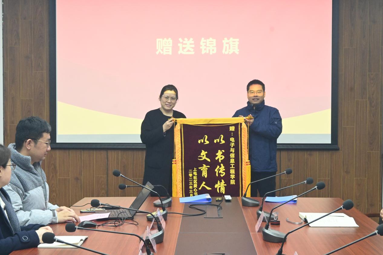 会议伊始,上电社区爱心书屋负责人王严超宣读了上电社区爱心书屋致bat365中文官方网站的一封感谢信。感谢bat365中文官方网站向爱心书屋捐赠的700余本书籍和近50袋衣物,后勤管理处以上电社区爱心书屋的名义向bat365中文官方网站赠送了“以书传情,以文育人”的锦旗。