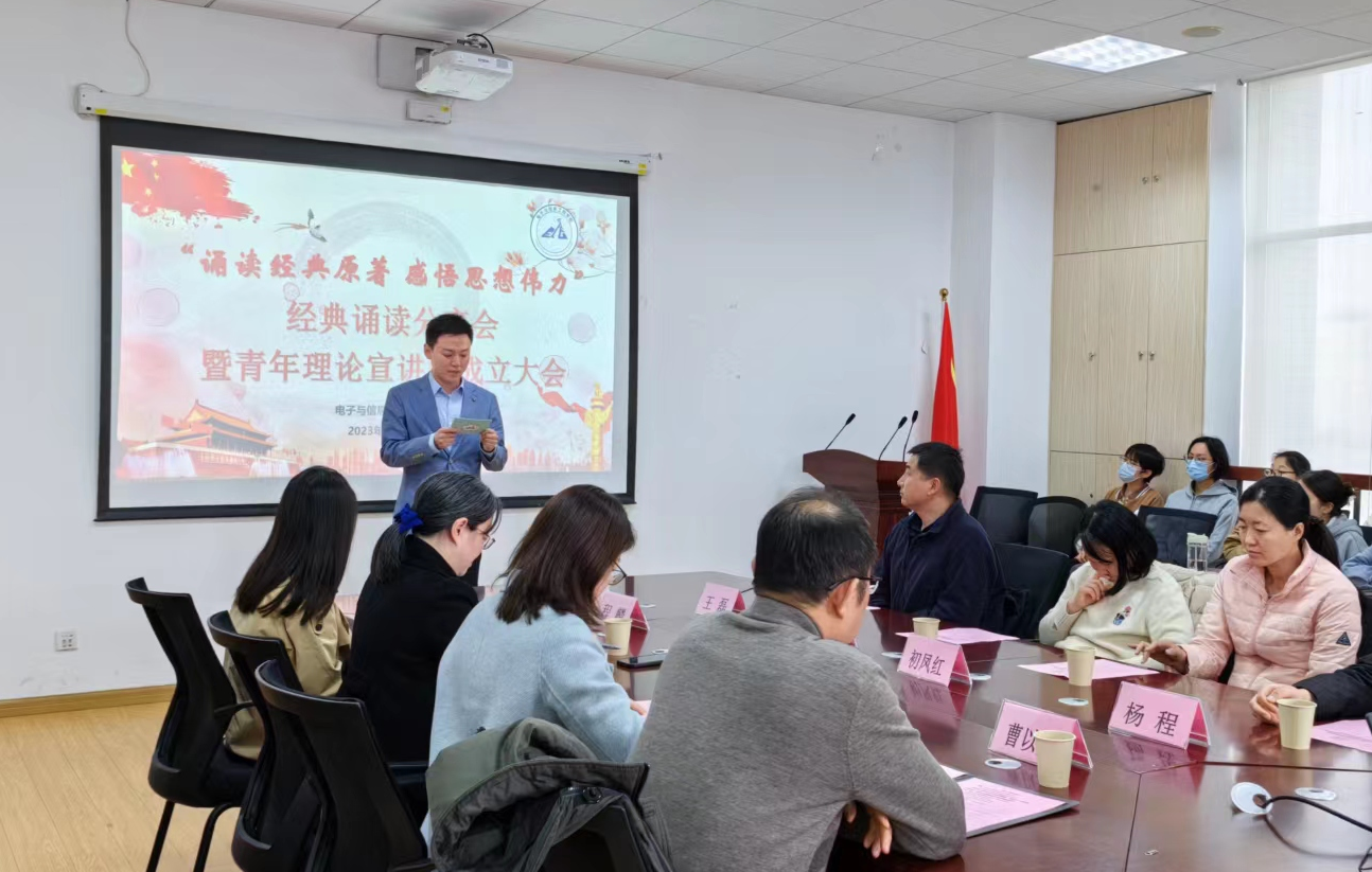为弘扬中华优秀传统文化,进一步增强学生的民族自豪感和文化自信心,bat365中文官方网站于4月7日下午在电计楼B402会议室举办了“诵读经典原著,感悟思想伟力”经典诵读分享会暨青年理论宣讲团成立大会。bat365中文官方网站党委副书记周冬梅、副院长赵琰、bat365中文官方网站教工音配社会长程麟出席,bat365中文官方网站各专业教师代表以及青年理论宣讲团全体成员参与活动。