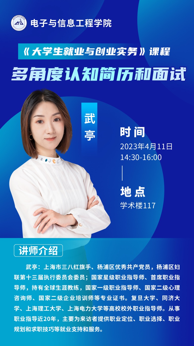 此次课程由bat365官网校外职业指导师武亭主讲。武亭为上海市三八红旗手、杨浦区优秀共产党员,杨浦区妇联第十三届执行委员会委员;国家星级职业指导师、首席职业指导师,持有全球生涯教练,国家一级职业指导师、国家二级心理咨询师、国家二级企业培训师等专业证书。在职业定位、职业选择、职业规划和求职技巧等方面有近20年的指导经验。