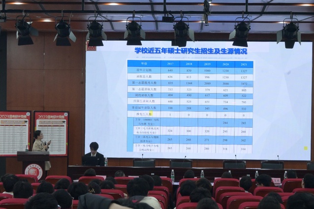 学院党委委员蒋伟介绍了2023年本校硕士研究生招生和生源情况,并分析了近几年一志愿分数线和调剂分数线及其变动情况。还重点分析了学院学术型学位点和专业型学位点,为同学们在专业选择方面提供了指导。