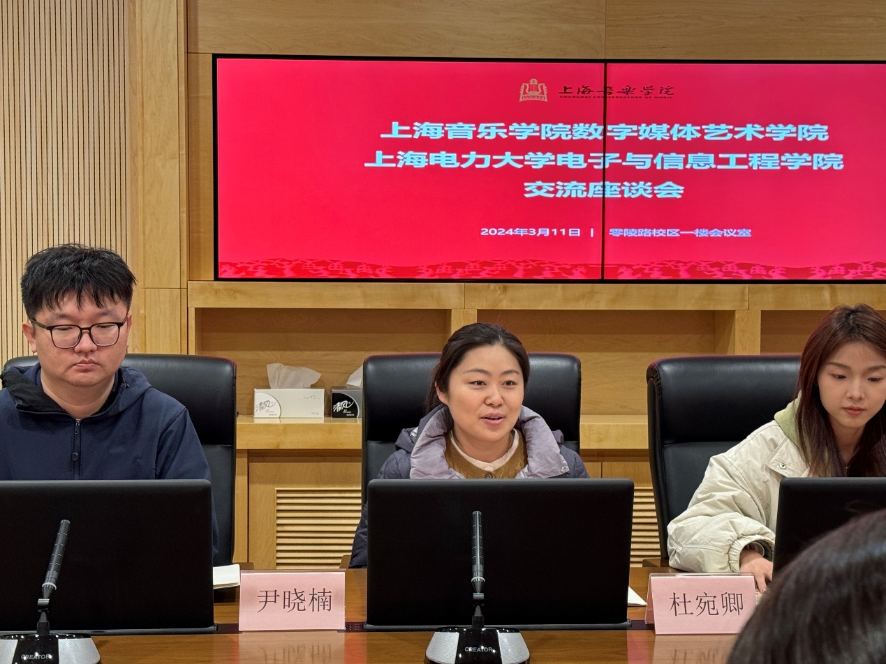 尹晓楠对bat365中文官方网站一行的到访表示热烈欢迎。她表示,bat365中文官方网站和上海音乐学院在工科和艺术学科领域各具优势,希望通过双方的共建联动能够探索出一条学生管理建设的创新之路。她介绍了数字媒体艺术学院以传媒为核心、音乐为特色、技术为支撑的学院特色以及专业设置基本情况,并指出目前学院也在不断优化“教创演研一体化”人才模式,通过借助人工智能AI、电子信息类的知识等,培养学生的创意思维和数字技术等能力。