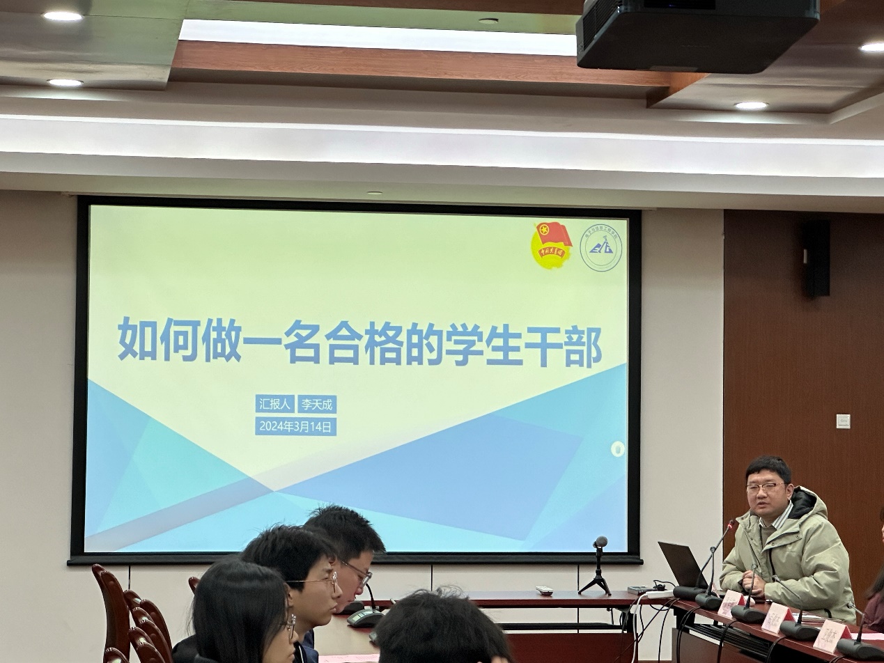 李天成作题为“如何做一名合格的学生干部”的培训。他指出,学生干部身处学生会和研究生会组织,需要了解所在组织的体系和组织架构,熟悉学生会和研究生会章程。他通过几个具体案例和视频分享,希望与会人员能够平衡好学习和工作,热心为同学服务,在传承的基础上以与时俱进的态度进行创新,同时保持谨慎谦虚和自我反省的态度,倾听同学意见,不断完善自我。最后寄语同学们明确角色和职能的定位,坚定理想,积极弘扬和践行社会主义核心价值观,不要忘记初心以及所肩负的历史使命,热爱祖国,把自己的青春梦想与祖国的前途、民族的复兴、人民的幸福深度融合。