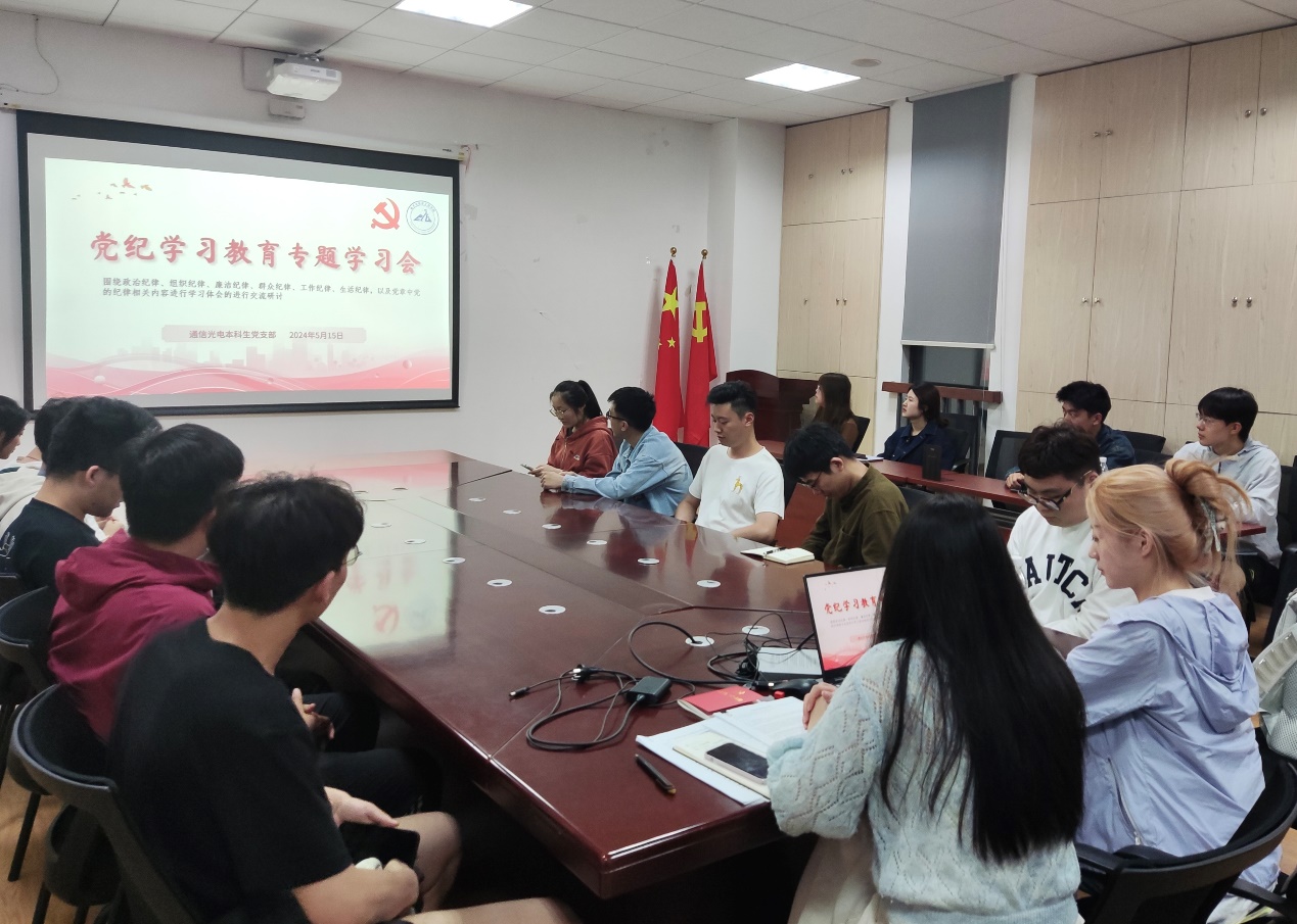 为深入开展党纪学习教育,进一步使党纪党规入脑入心,引导党员不断增强纪律意识,在支部内营造学纪、知纪、明纪、守纪的良好氛围,5月15日晚上,通信光电本科生党支部在电计楼B402会议室开展《中国共产党纪律处分条例》学习和党纪学习教育专题学习会,联系支部的bat365中文官方网站党委书记何西培和支部全体党员参会,会议由支部书记刘甘雨主持。