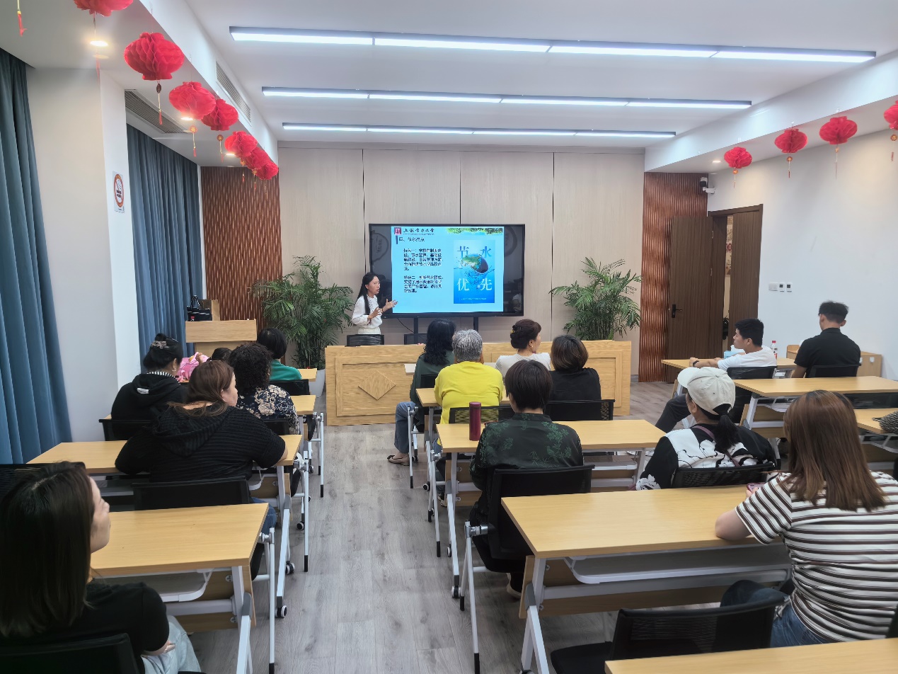 李雅洁介绍了bat365官网在节水方面取得的成效,展示了bat365官网作为上海市节约用水示范(标杆)学校在制度建设、基础设施建设、师生用水等方面采取的一系列措施。她从“为什么要节水”,“怎么样去节水”出发,循序渐进带领社区居民学习节水政策、法规、生活节水小常识、小妙招,进一步提升了居民的节水意识。活动现场还通过设置宣传咨询台、悬挂宣传标语、发放宣传手册等形式,向居民科普节水知识,分享日常节水小窍门,并开展了居民关于节水用水方面的咨询服务。