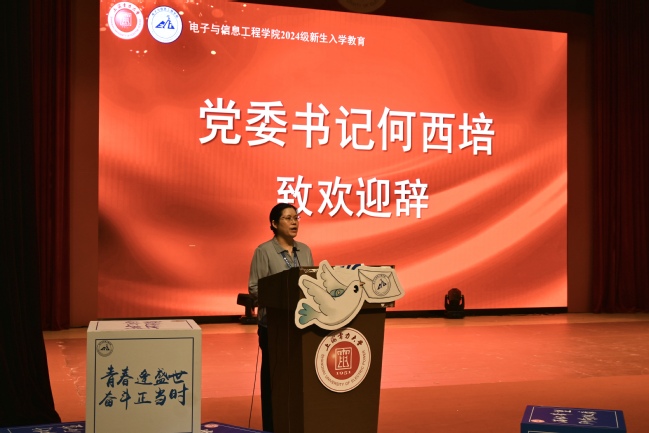 大会伊始,何西培代表全院师生对2024级全体新生的到来表示热烈欢迎。致辞中,她介绍了学院的发展历史与院系文化,希望新生牢记“立德求知、创新求是”的院训,树立“院兴我兴、院荣我荣”的集体荣誉感,珍惜来之不易的学习机会,以饱满的热情、昂扬的斗志投入到未来的学习和生活中去,读好书、结好友、成大业,通过学习和实践,不断培养自我人文素养和专业素养,树立正确的世界观、人生观和价值观,努力去实现自己的梦想,创造出属于自己的辉煌人生。