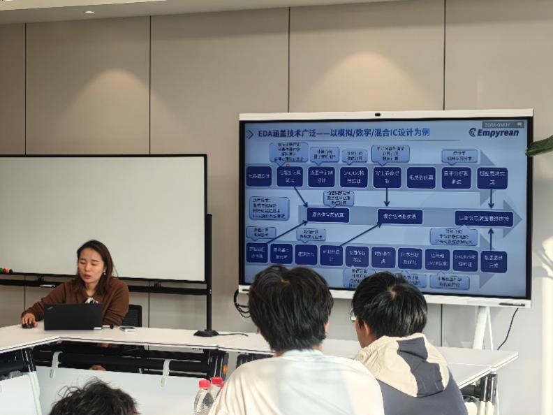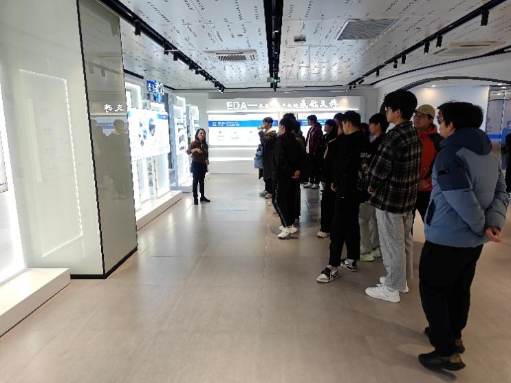 腊晓丽带领师生们首先参观了华大九天的展示区,详细了解了公司在集成电路设计自动化(EDA)工具领域的最新进展和产品。同学们对华大九天在EDA工具的创新成果表现出浓厚兴趣,包括模拟/数字/混合IC设计、版图全定制设计、寄生参数提取、电路后仿真等一系列EDA工具和解决方案。